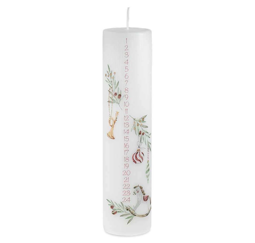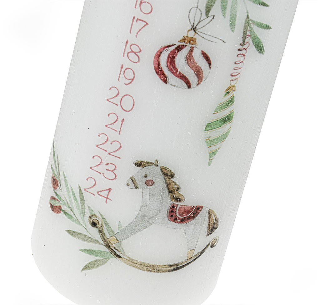 Tato širší adventní svíčka nabízí více prostoru pro detailní ilustrace kolekce Nostalgie.