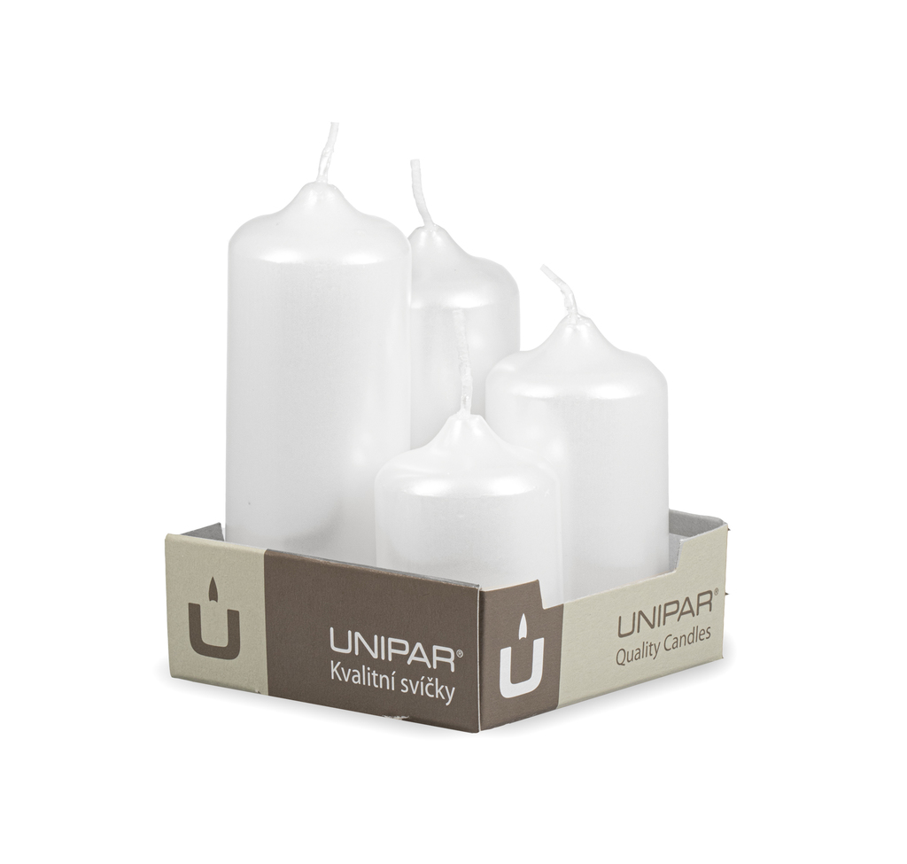 Adventní svíčky v bílé metalické barvě v odstupňovaných velikostech (40x60, 40x75, 40x90, 40x105 mm).
