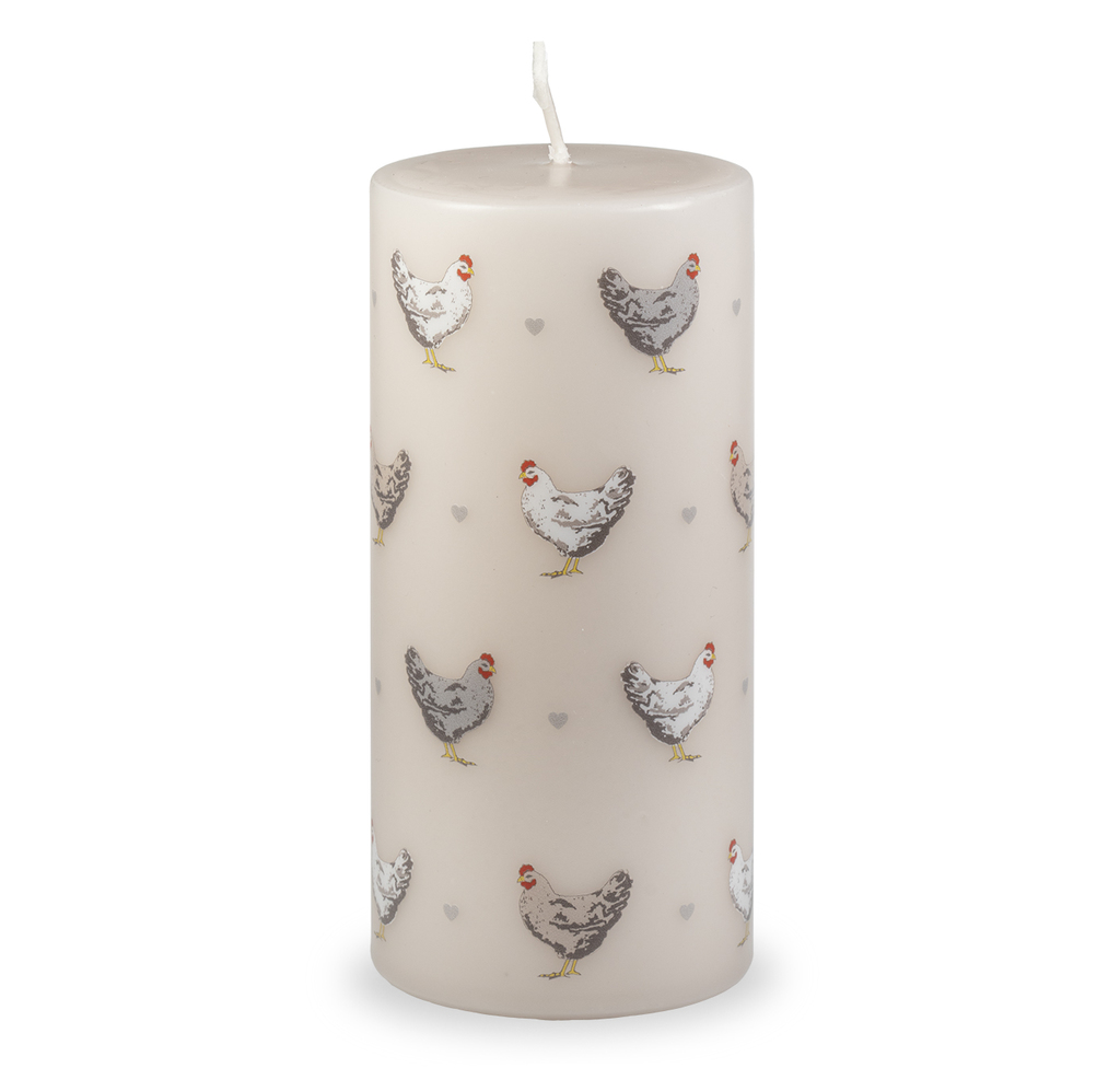 Béžová svíčka s motivem barevných slepiček vám vykouzlí úsměv na tváři.