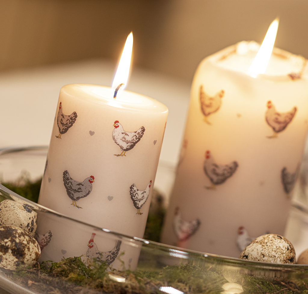 Béžová svíčka s motivem barevných slepiček vám vykouzlí úsměv na tváři.