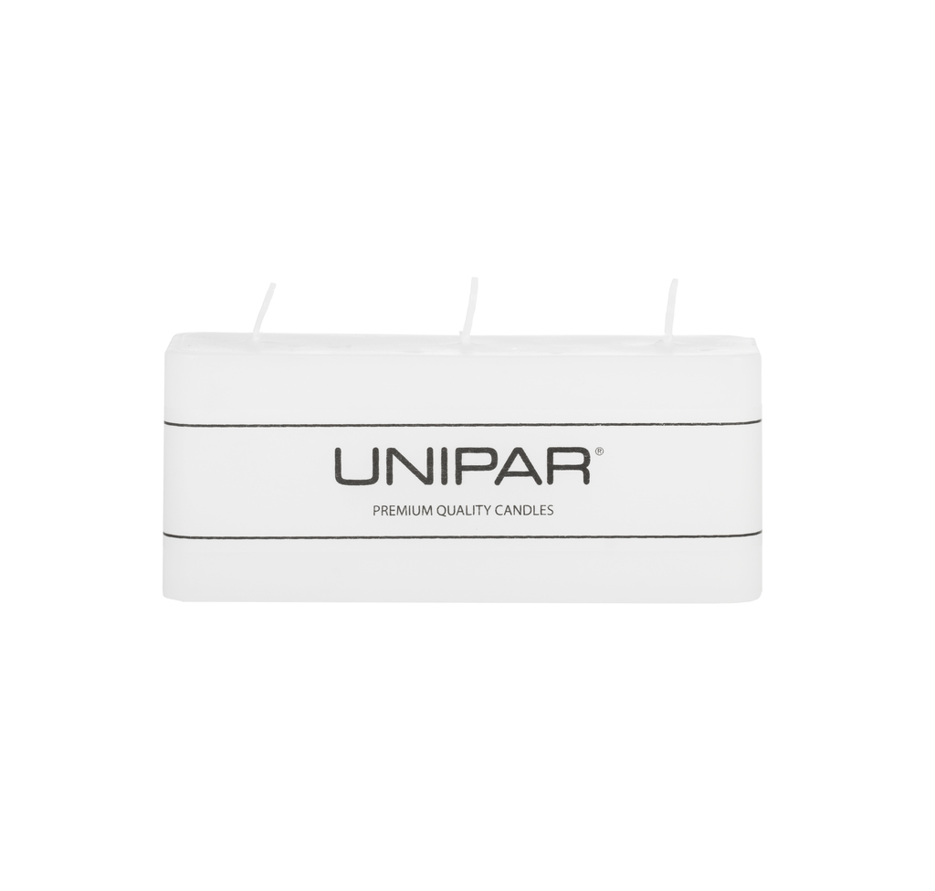 Bílá neutrální hranatá svíčka se zaoblenými rohy a třemi knoty o velikosti 5,5x16x6,5 cm v jednoduchém skandinávském stylu.