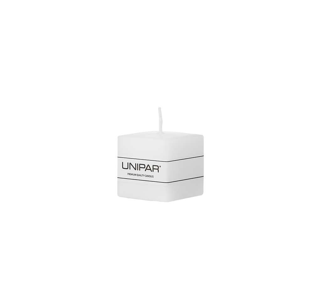 Bílá neutrální hranatá svíčka o velikosti 5x5x5 cm v jednoduchém skandinávském stylu, která se bude hodit do různých svícnů a luceren, na adventní věnce, nebo jako samotná dekorace do vašeho interiéru.