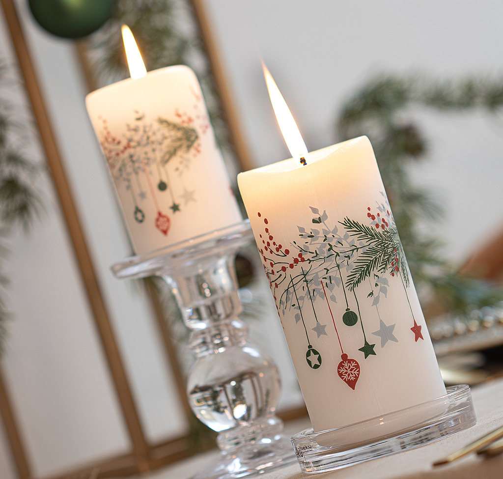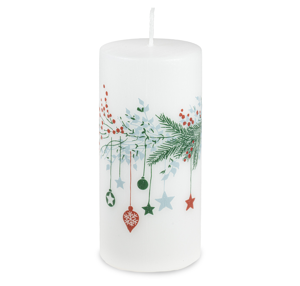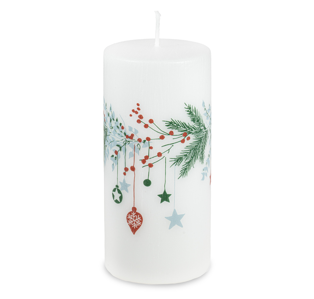 Originální středně velká svíčka s barevným vánočním motivem jehličí, šípků a vánočních ozdob.