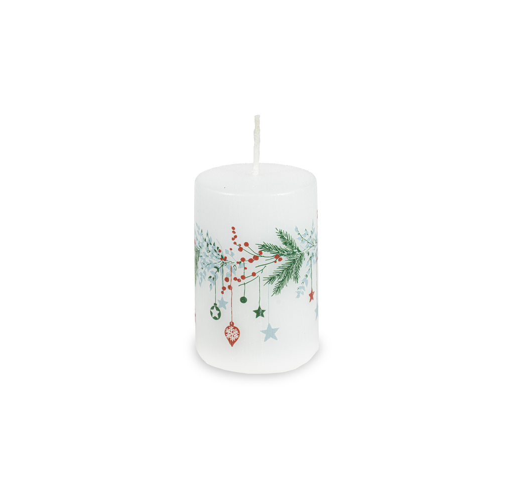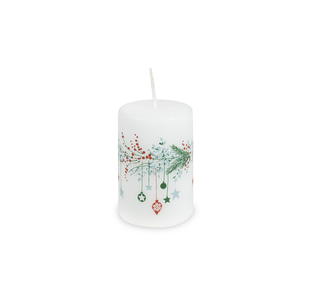 Bílý povrch svíčky zajistíte, že se snadno začlení do vánoční výzdoby a interiéru. Ozdoby, jehličí a šípky v pestrobarevných odstínech přinášejí tu pravou vánoční atmosféru a radost.