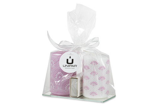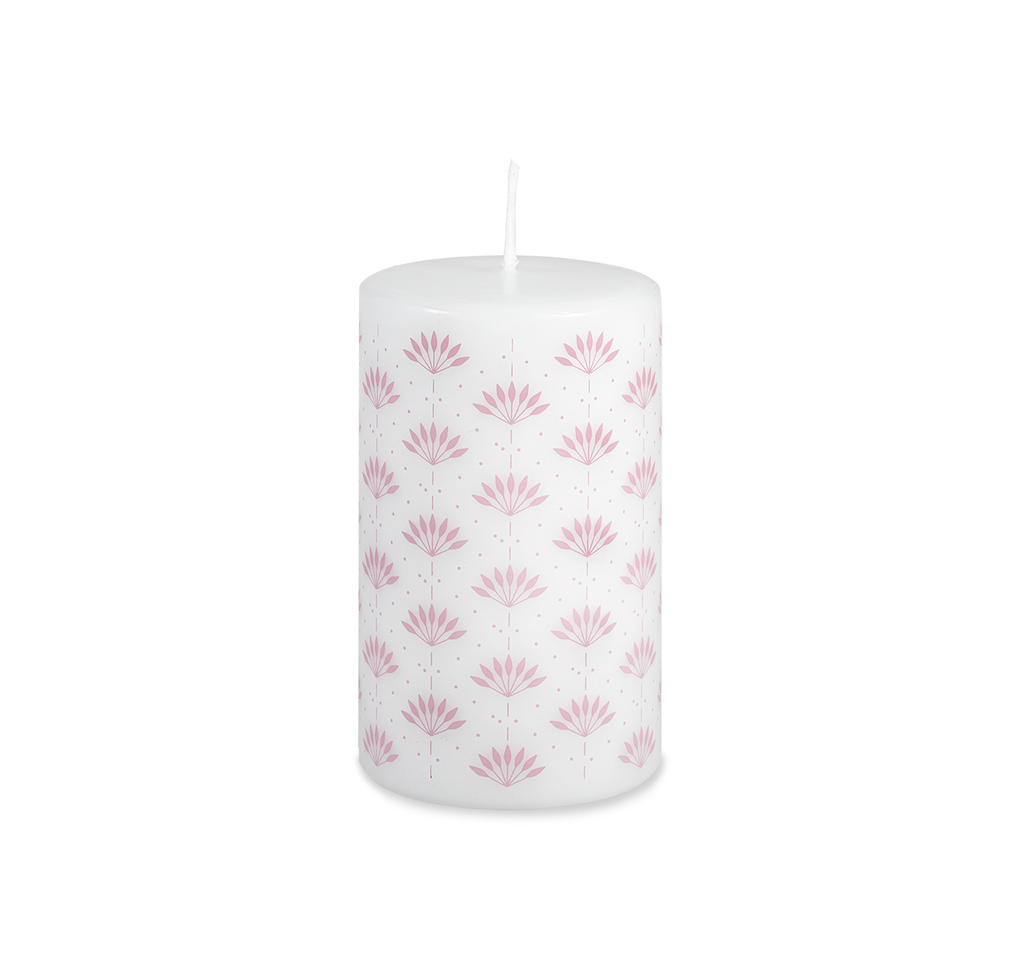 Bílá svíčka s elegantním dekorem malých růžových vějířků vás krásně naladí na přicházející teplé dny.