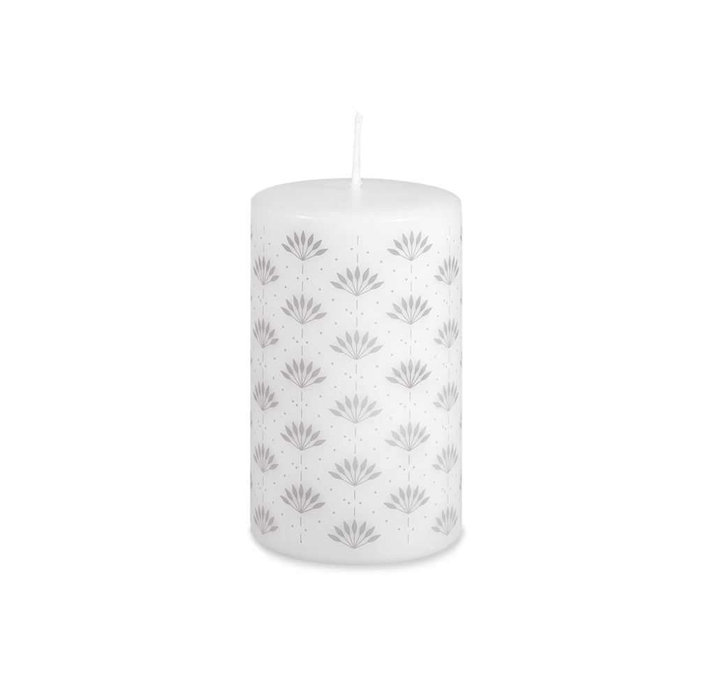 Bílá svíčka s elegantním dekorem malých šedých vějířků vás krásně naladí na přicházející teplé dny.