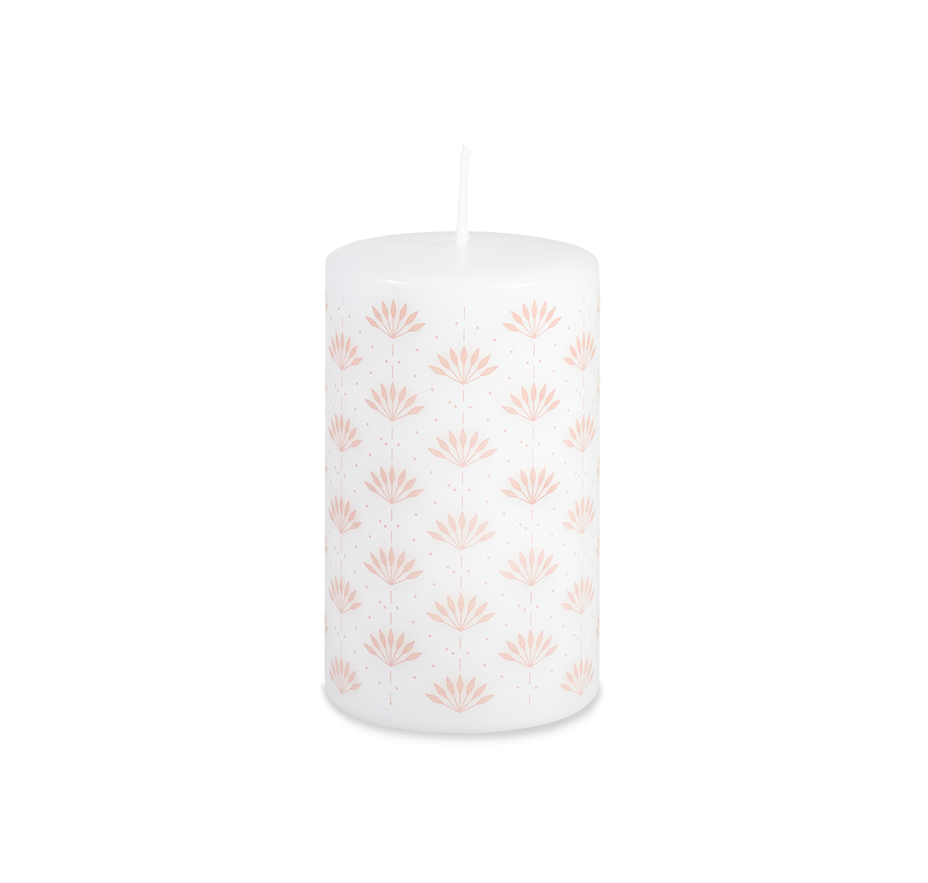 Bílá svíčka s elegantním dekorem malých světle oranžových vějířků vás krásně naladí na přicházející teplé dny.