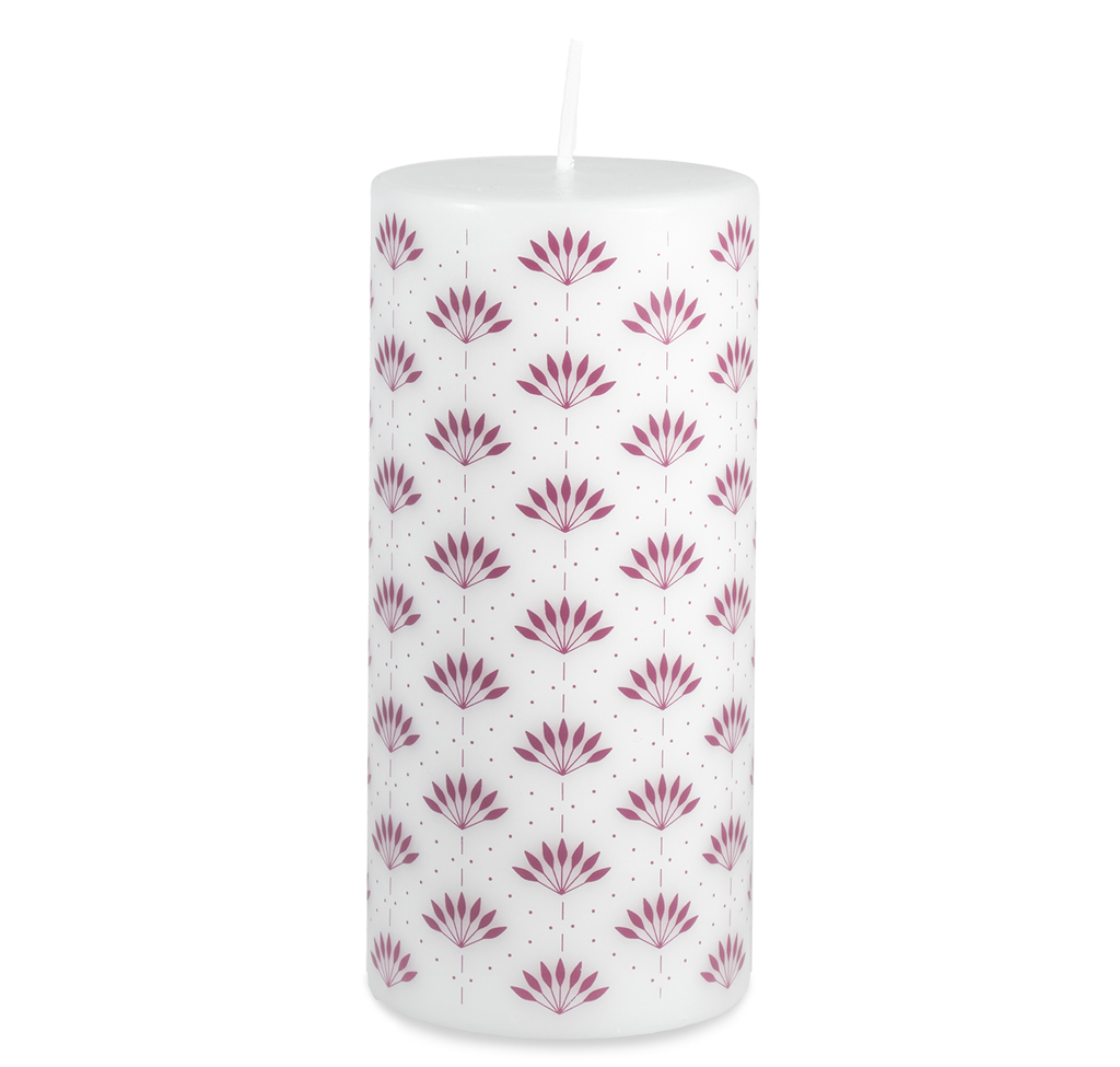 Bílá, velká svíčka s elegantním dekorem malých tmavě červených vějířků vás krásně naladí na přicházející teplé dny.