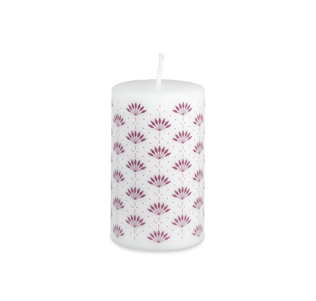 Bílá svíčka s elegantním dekorem malých tmavě červených vějířků vás krásně naladí na přicházející teplé dny.