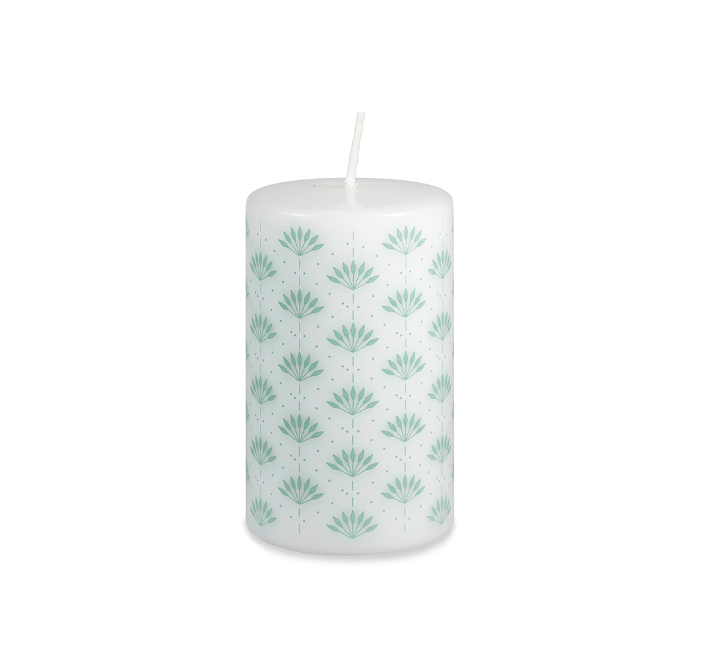 Bílá svíčka s elegantním dekorem malých tyrkysových vějířků vás krásně naladí na přicházející teplé dny.