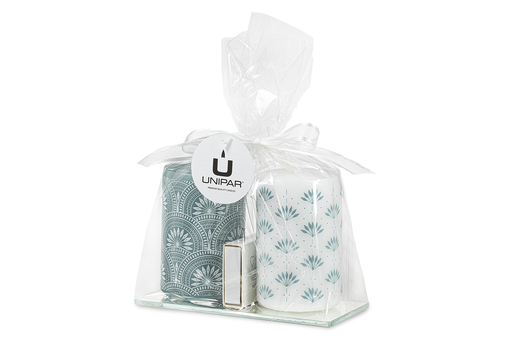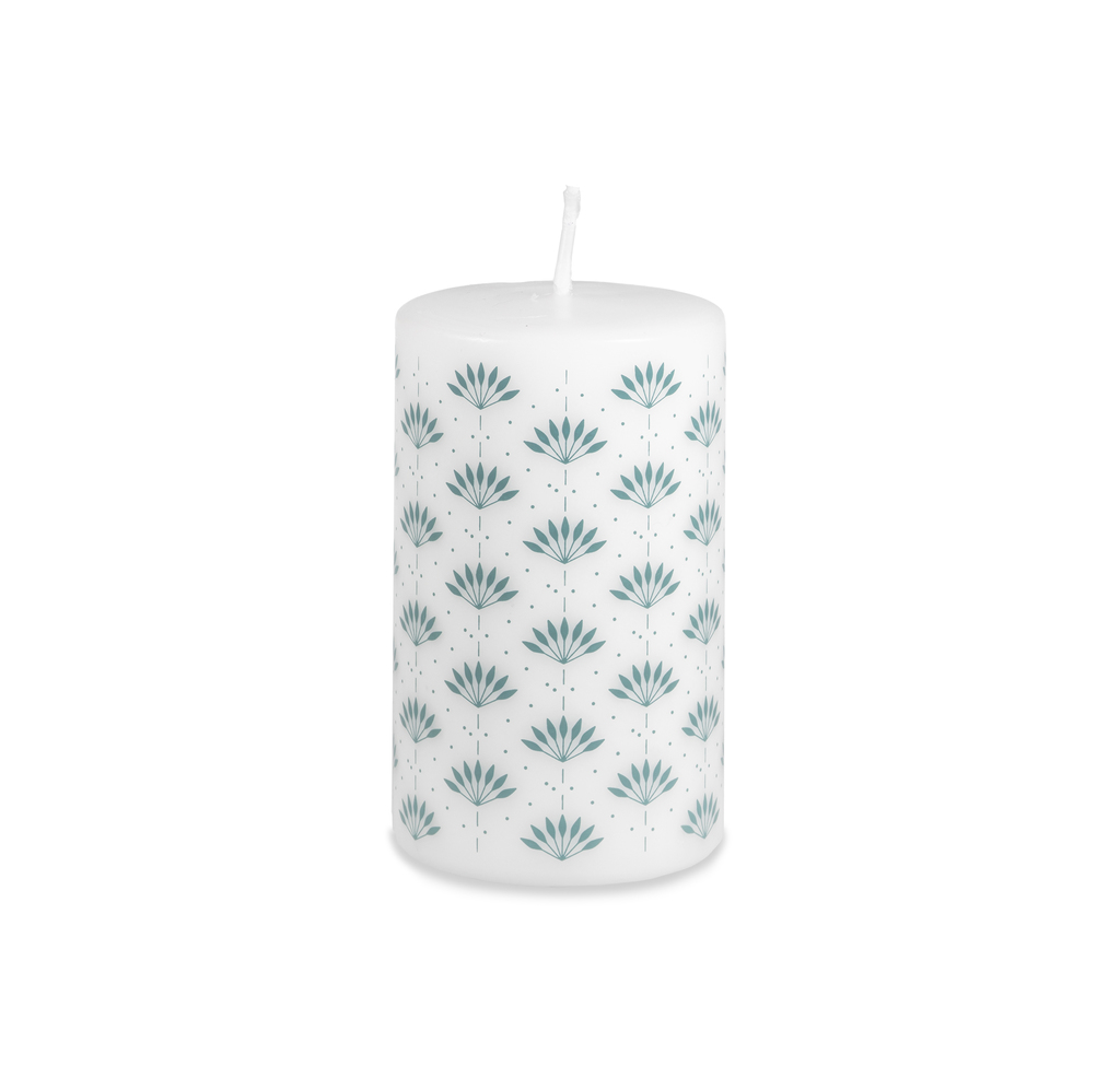 Bílá svíčka s elegantním dekorem malých zelených vějířků vás krásně naladí na přicházející teplé dny.
