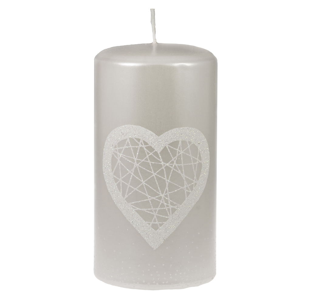 Velká svíčka v bílé perleťové barvě s třpytivým dekorem ve tvaru srdíčka a jemným zdobením teček ve spodní části svíčky.
