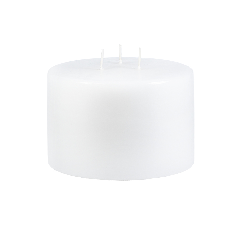 Bílá neutrální válcová svíčka se třemi knoty o průměru 15 cm a výšce 10 cm v jednoduchém skandinávském stylu.