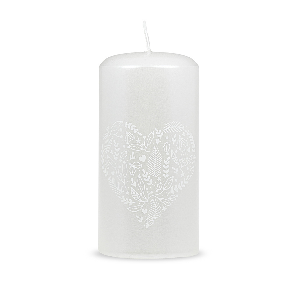 Svíčka v ledově bílé barvě s krásným zimním motivem ve tvaru srdce.