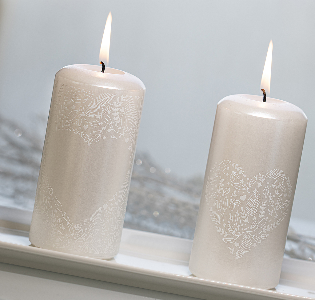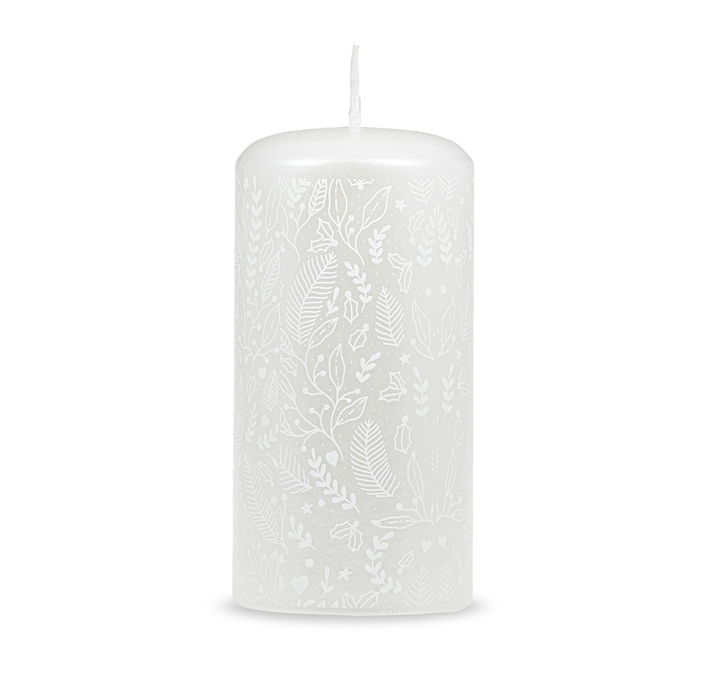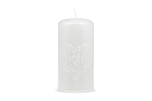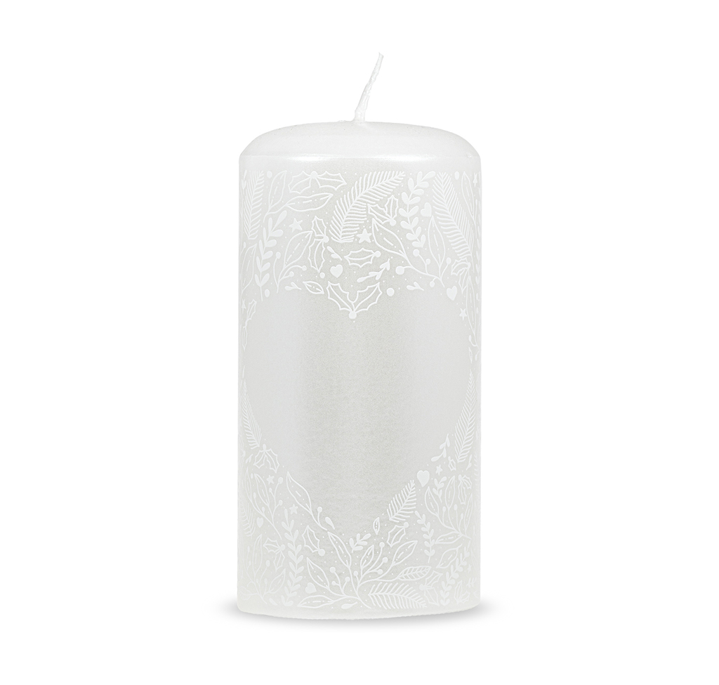 Svíčka v ledově bílé barvě s krásným zimním motivem po celé svíčce, který vytvoří z přední části tvar srdce.