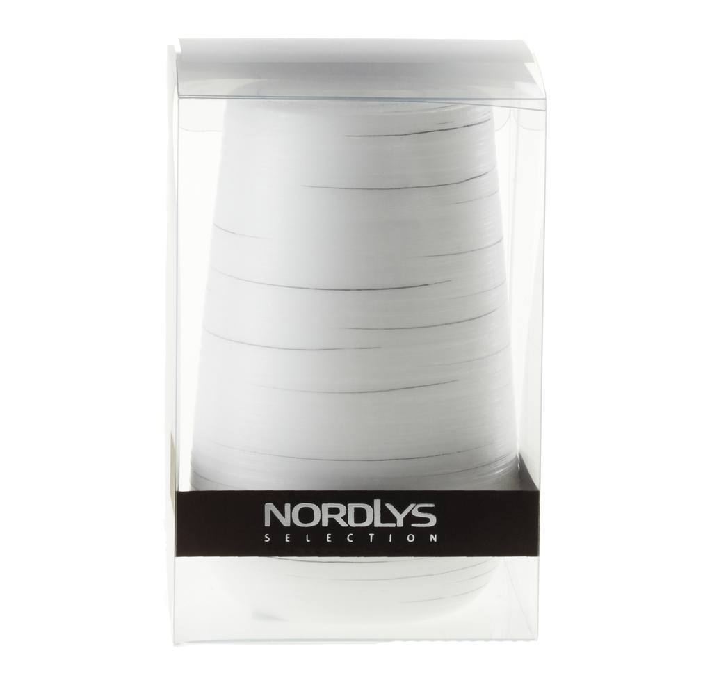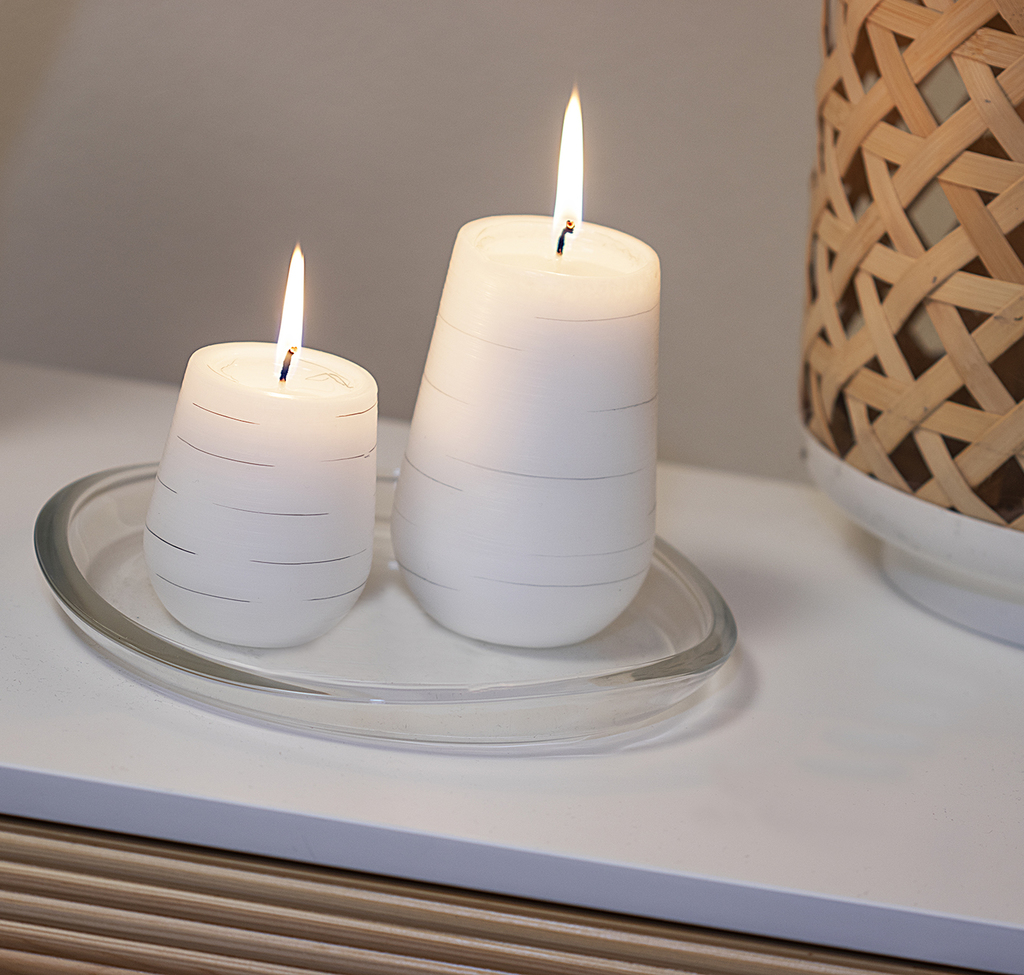 Elegantní bílá svíčka ve skandinávském stylu se strukturovaným povrchem, ručně dozdobená černými linkami.