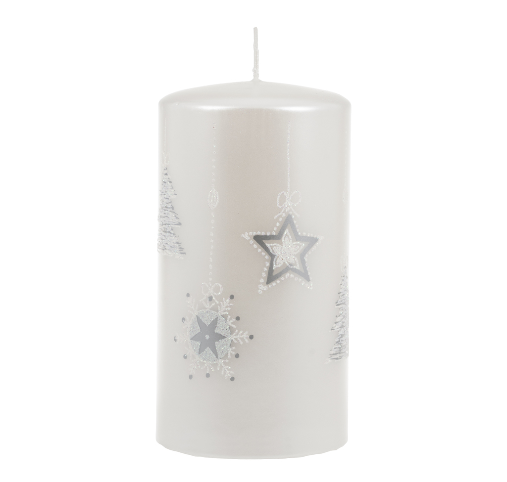 Tento design bílé svíčky má své kouzlo v jednoduchosti a jemnosti vánočních dekorů, které jsou pocukrované bílým třpytem.