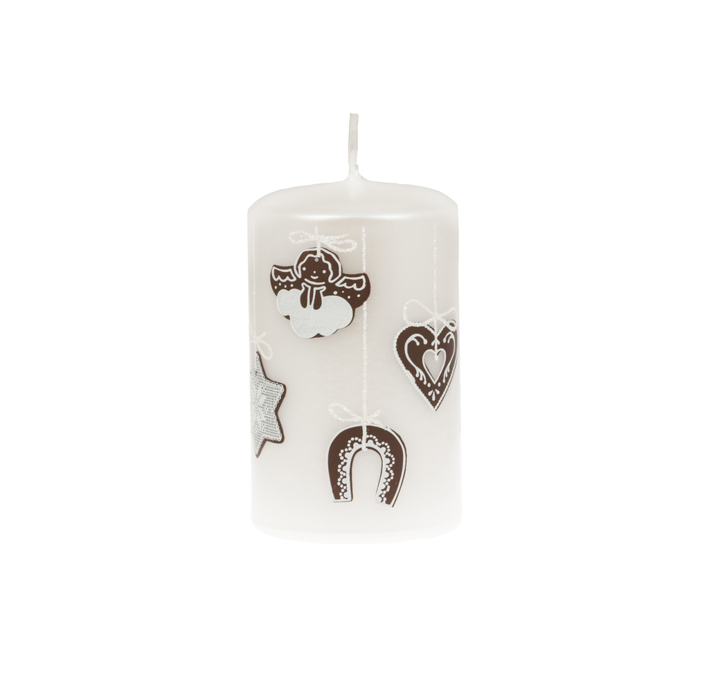 Vánoční svíčka v bílé barvě s tradičním vánočním dekorem zdobených perníčků.