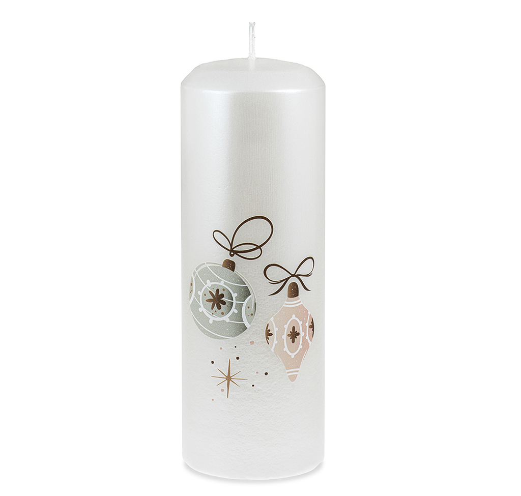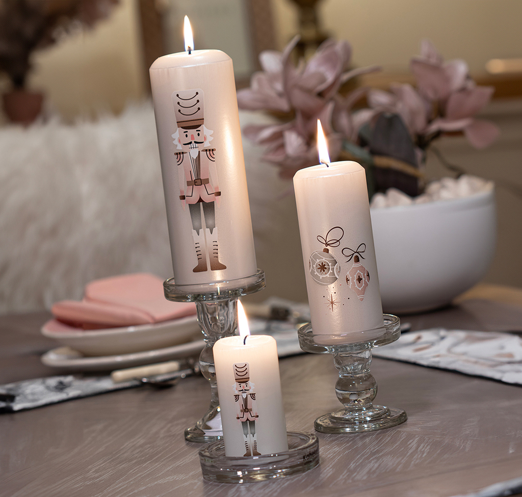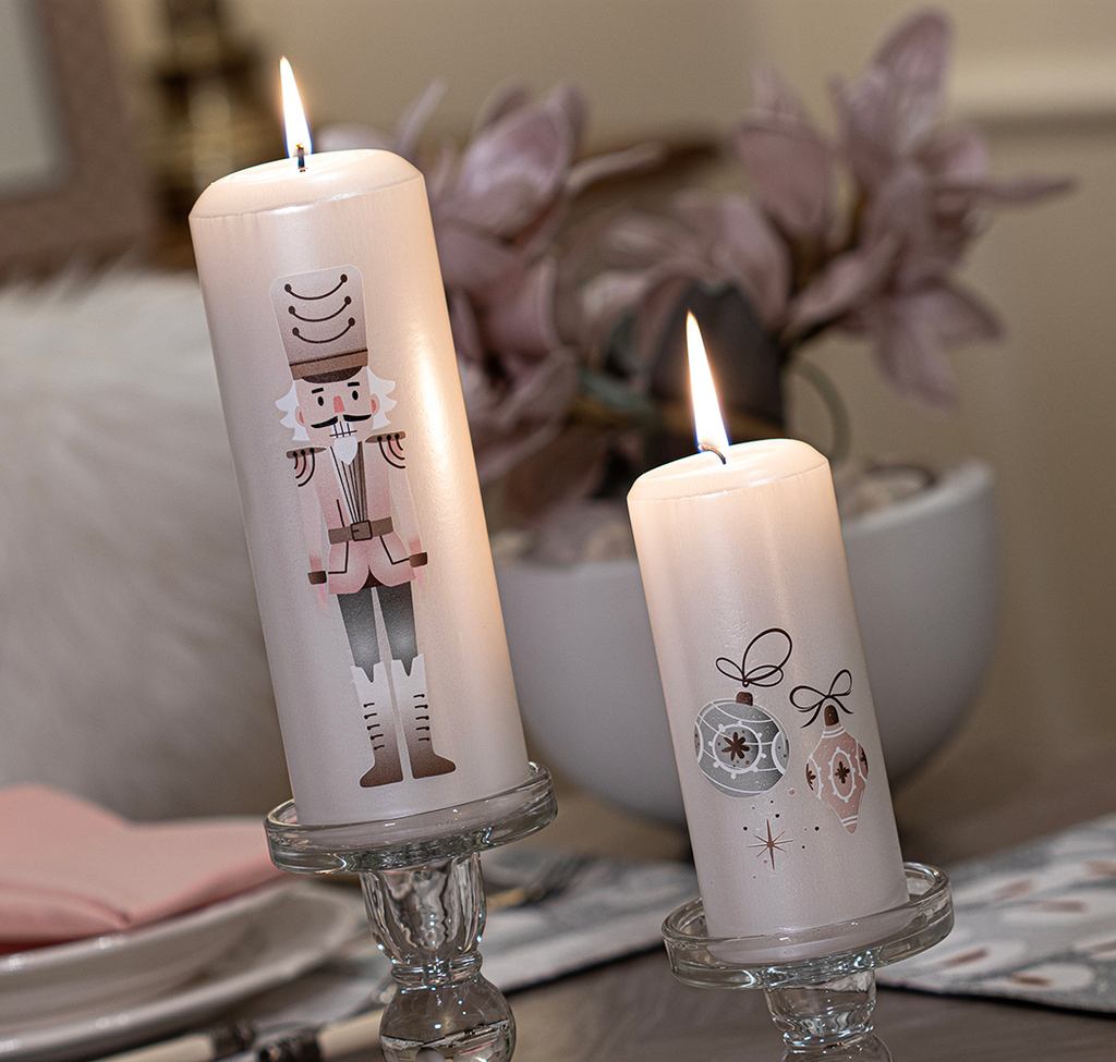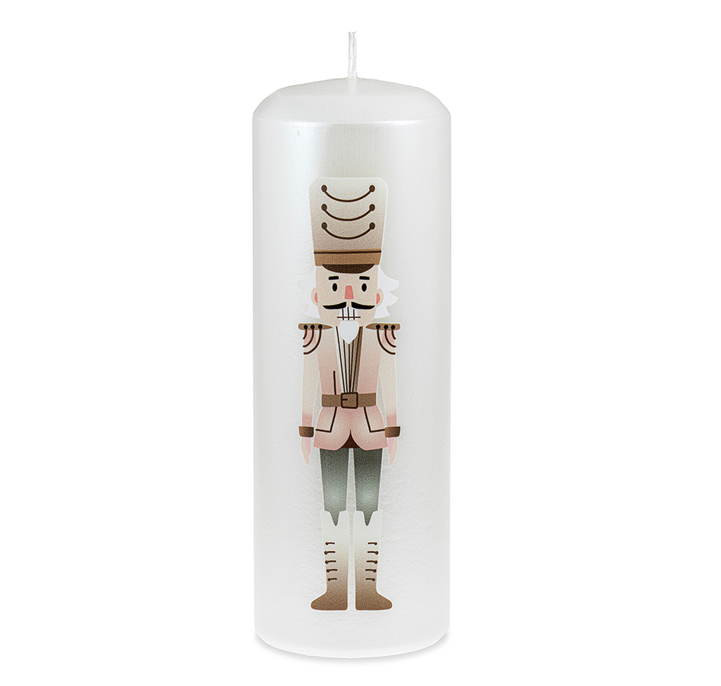 Bílá vánoční svíčka s růžovým louskáčkem (L)