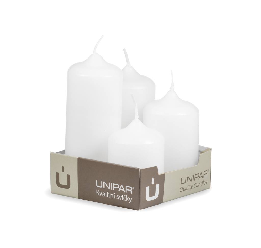 Adventní svíčky v bílé matné barvě v odstupňovaných velikostech (40x60, 40x75, 40x90, 40x105 mm).