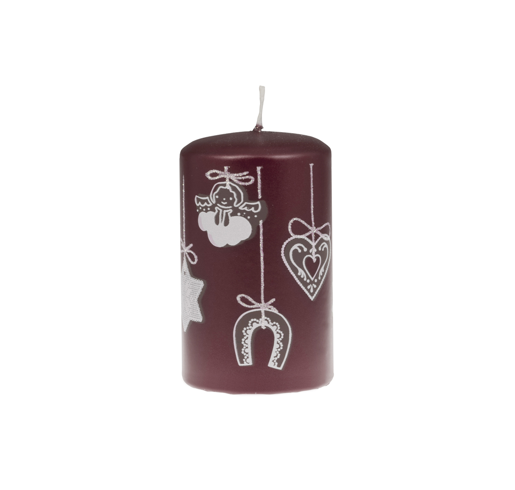 Vánoční svíčka v barvě bordó s tradičním vánočním dekorem zdobených perníčků.