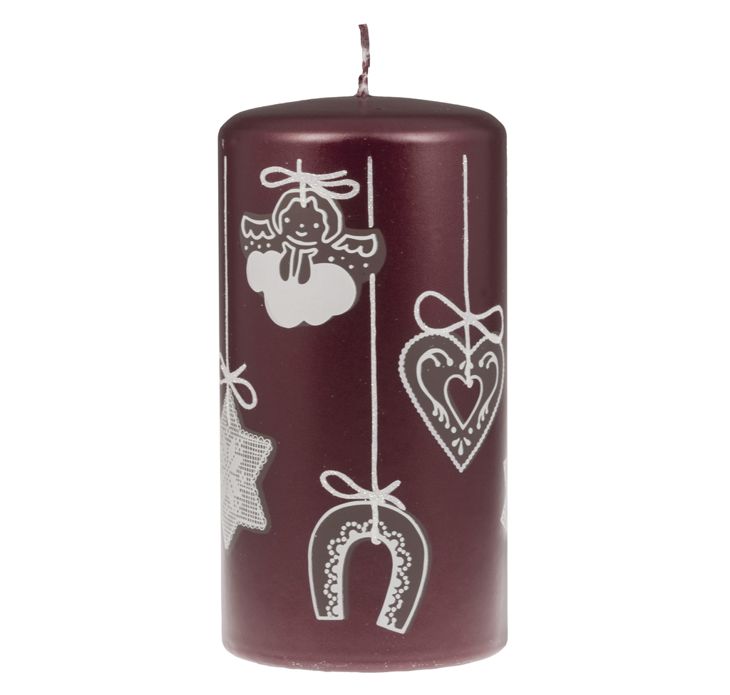Vánoční svíčka v barvě bordó s tradičním vánočním dekorem zdobených perníčků.