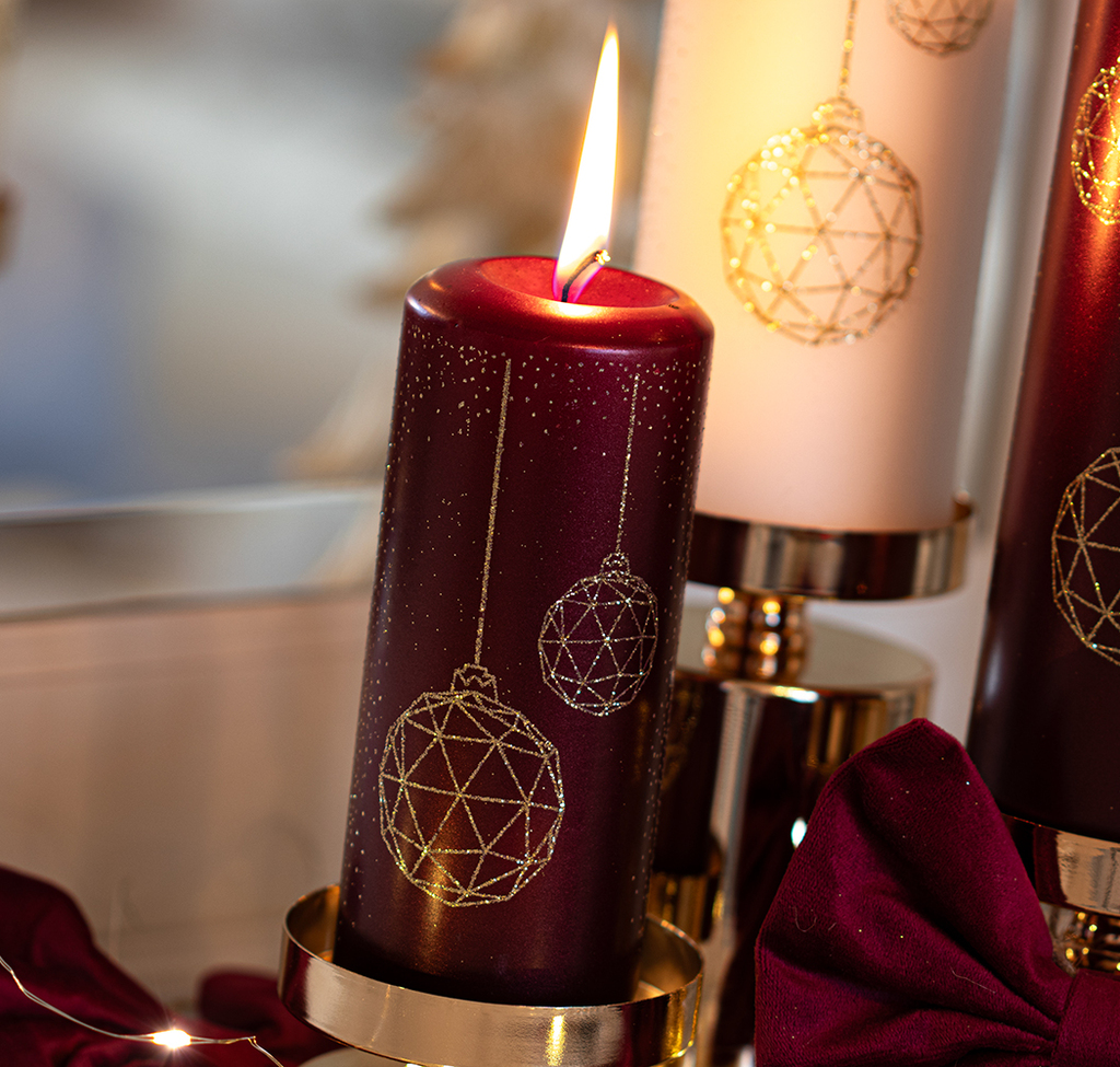 Střední vánoční svíčka v odstínu burgundy nabízí krásnou rovnováhu mezi výrazem a jemností. Zlaté baňky působí luxusně, dekor je precizní a moderní. Snadno zvýrazní neutrální barvy i tmavé tóny.