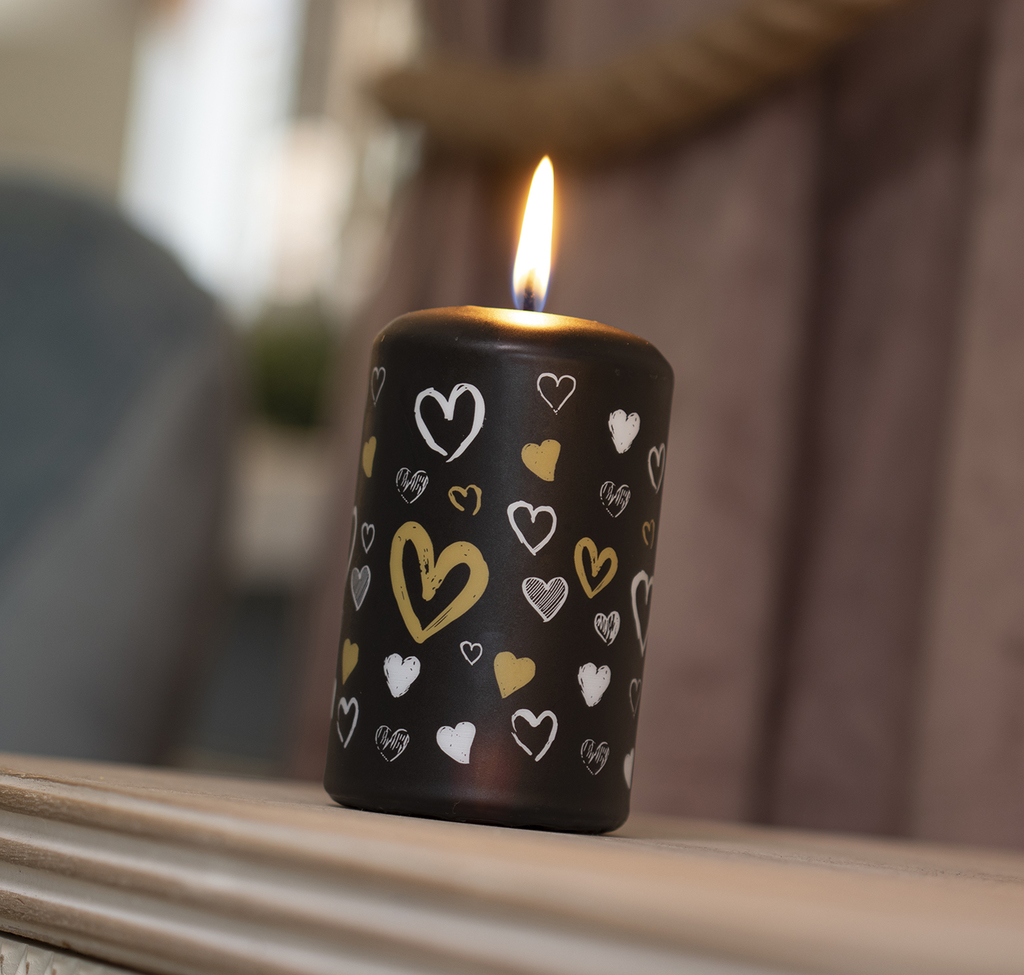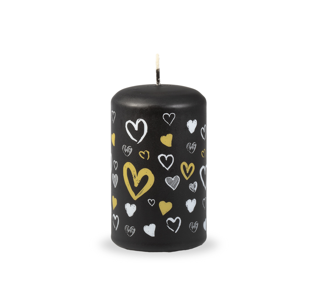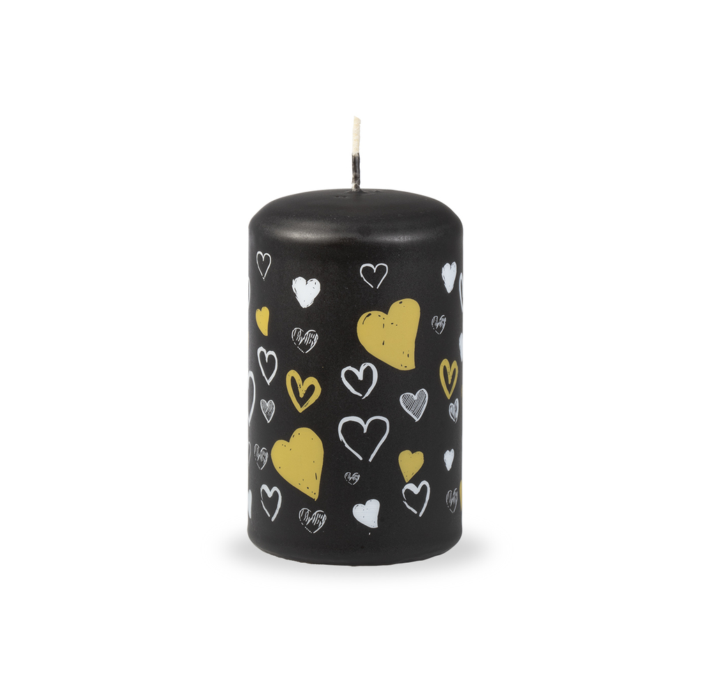 Svíčka v černé barvě potištěná srdíčky různých velikostí. Srdíčka jsou v barvě hořčicové a bílé.