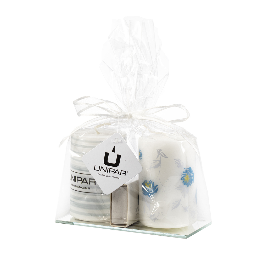 Dárkový balíček dvou svíček z různých kolekcí laděných do modro-šedých odstínů.