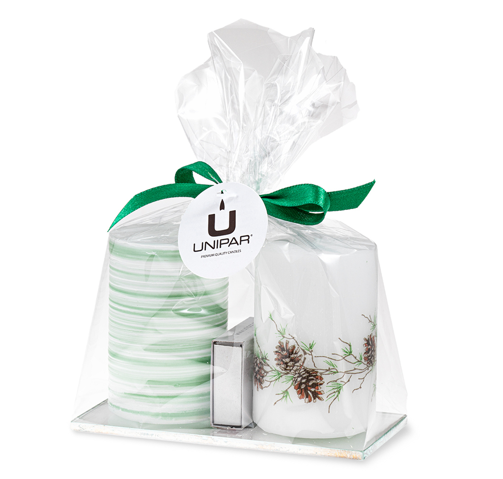 Tento dárkový balíček propojuje designovou svíčku Pine s ručně zdobenou rustikální svíčkou Infinity v barvách, které dokonale ladí s přírodním motivem kolekce. Obě svíčky jsou vystaveny na skleněném zrcátku, které jim dodává jemný, elegantní odlesk. Součástí balíčku jsou také stylové zápalky. To vše je zabalené v celofánu a převázané mašlí, připravené přímo k darování.