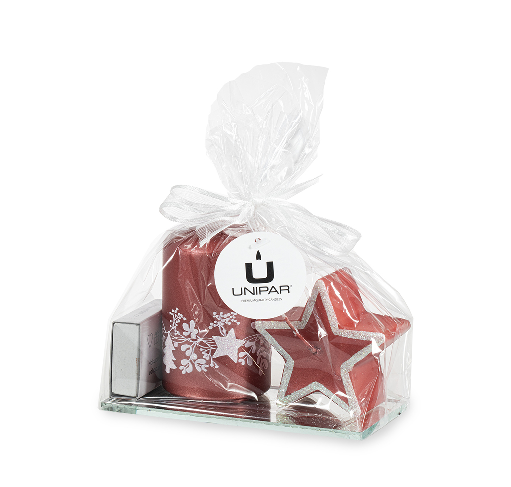 Dárkový balíček obsahující dvě vánoční svíčky (válec 50-75 mm, plovoucí hvězda 60-30 mm) v metalízových barvách na skleněném zrcátku a zápalky.
