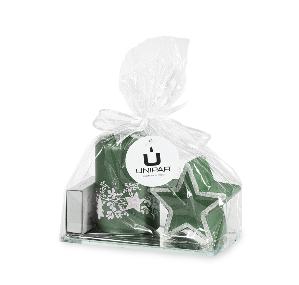 Dárkový balíček obsahující dvě vánoční svíčky (válec 50-75 mm, plovoucí hvězda 60-30 mm) v metalízových barvách na skleněném zrcátku a zápalky.