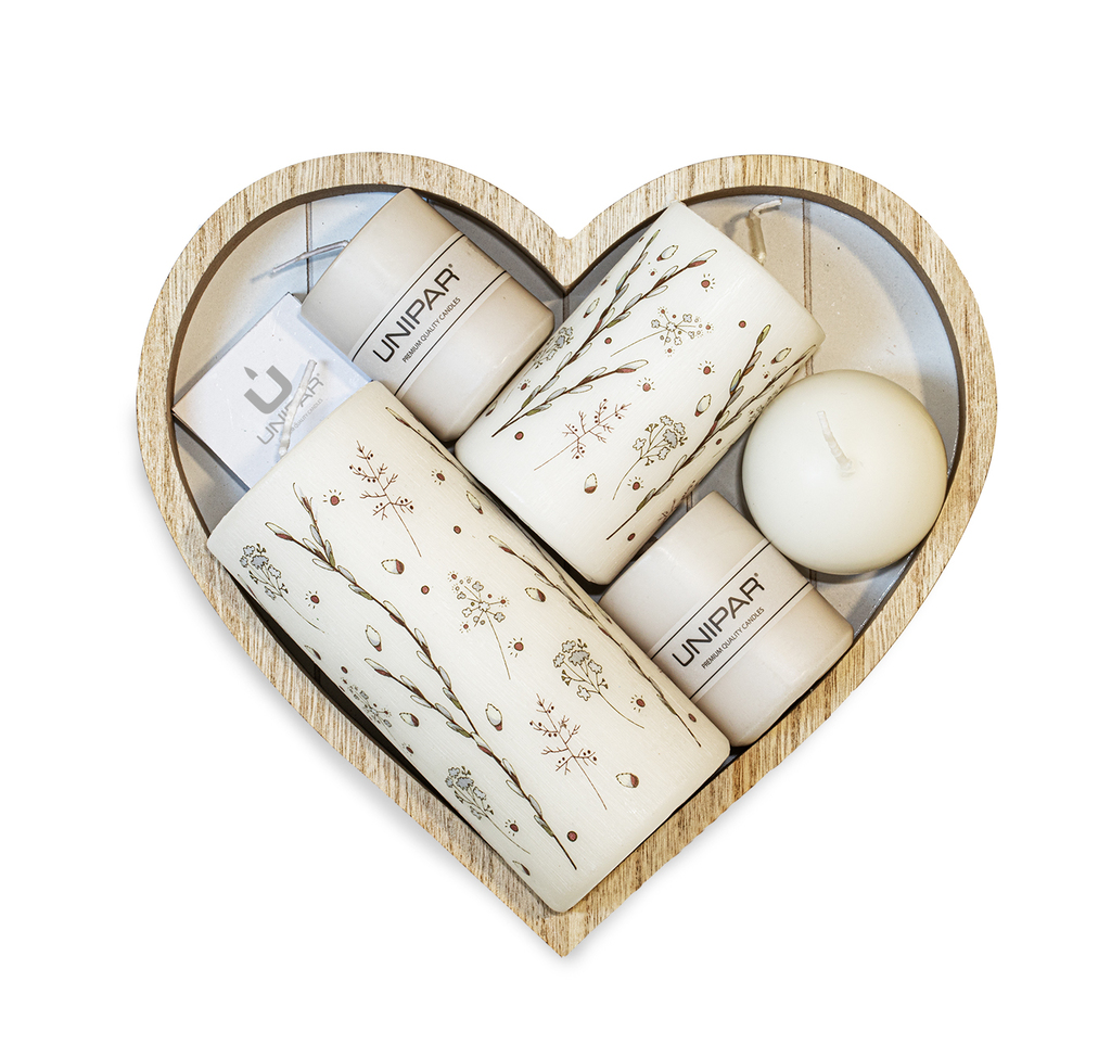 Balíček těchto svíček zdobí nádherný motiv kočiček v něžných odstínech bílohnědé barvy. Kromě toho každý balíček zahrnuje krásnou dřevěnou podložku ve tvaru srdce, která vytváří dekorativní prvek, na který se s radostí budete dívat.
