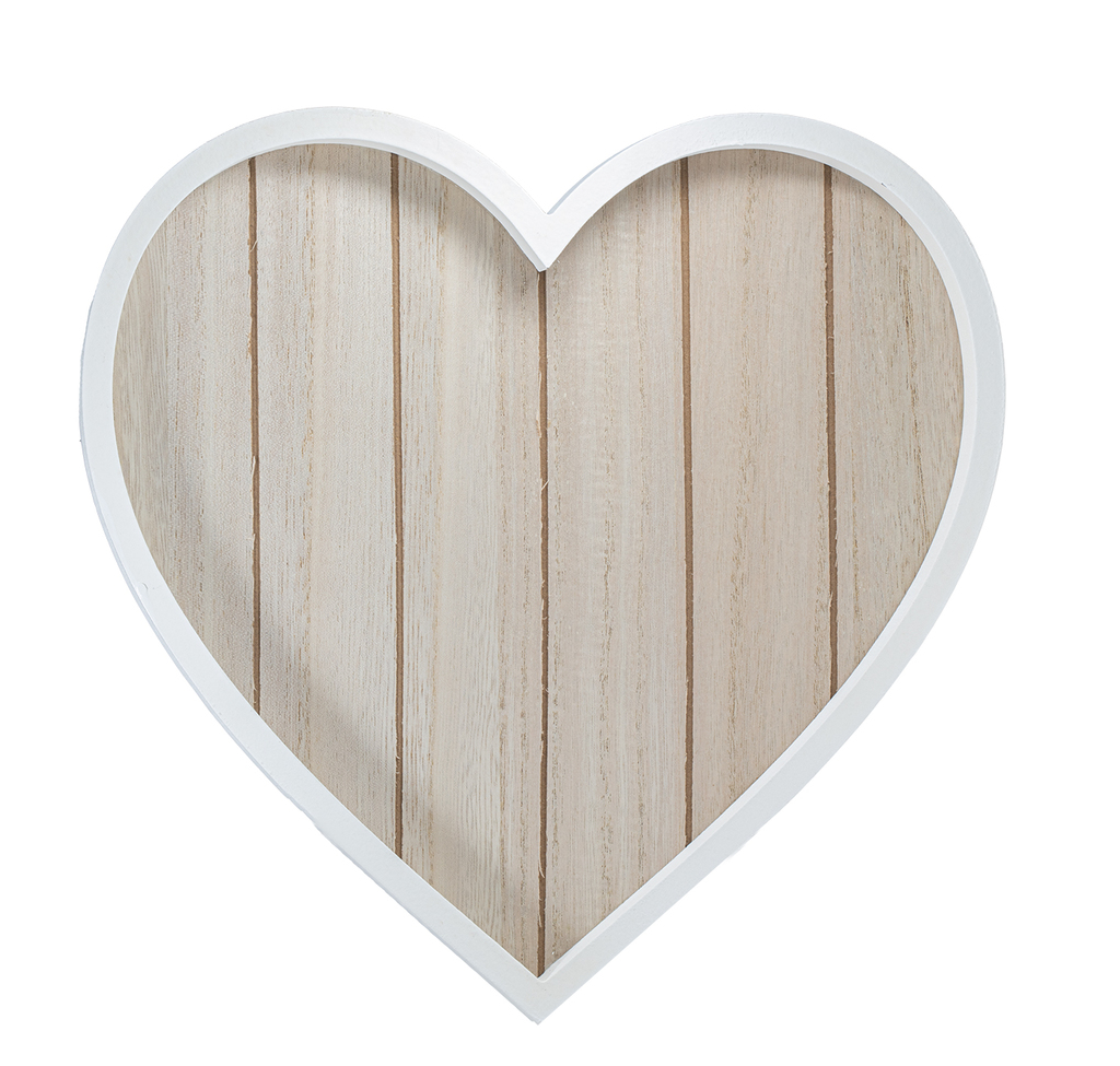 Větší podložka ve tvaru srdíčka je vyrobená z MDF překližky a dřeva v kombinaci bílé a přírodní barvy.
