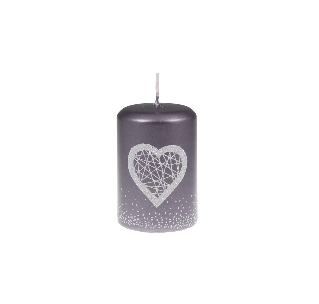 Malá svíčka v moderní fialové metalické barvě s třpytivým dekorem ve tvaru srdíčka a jemným zdobením teček ve spodní části svíčky.