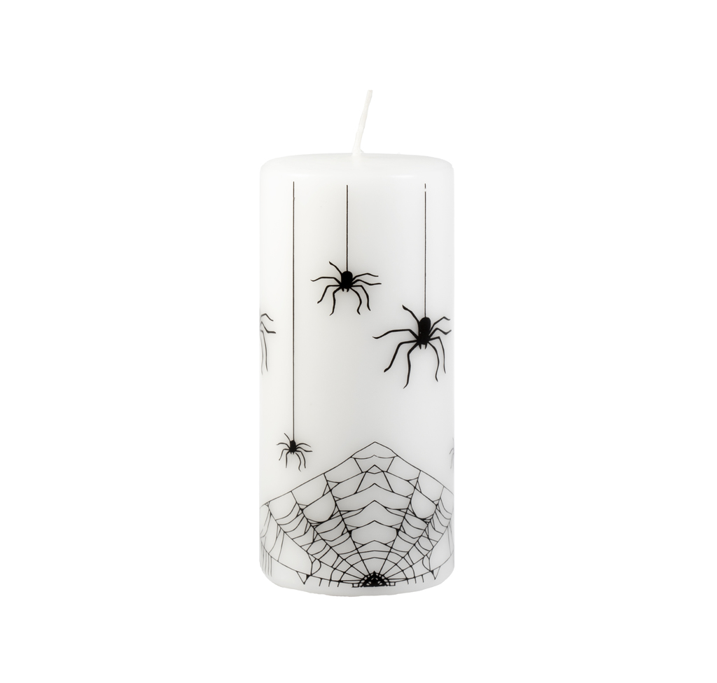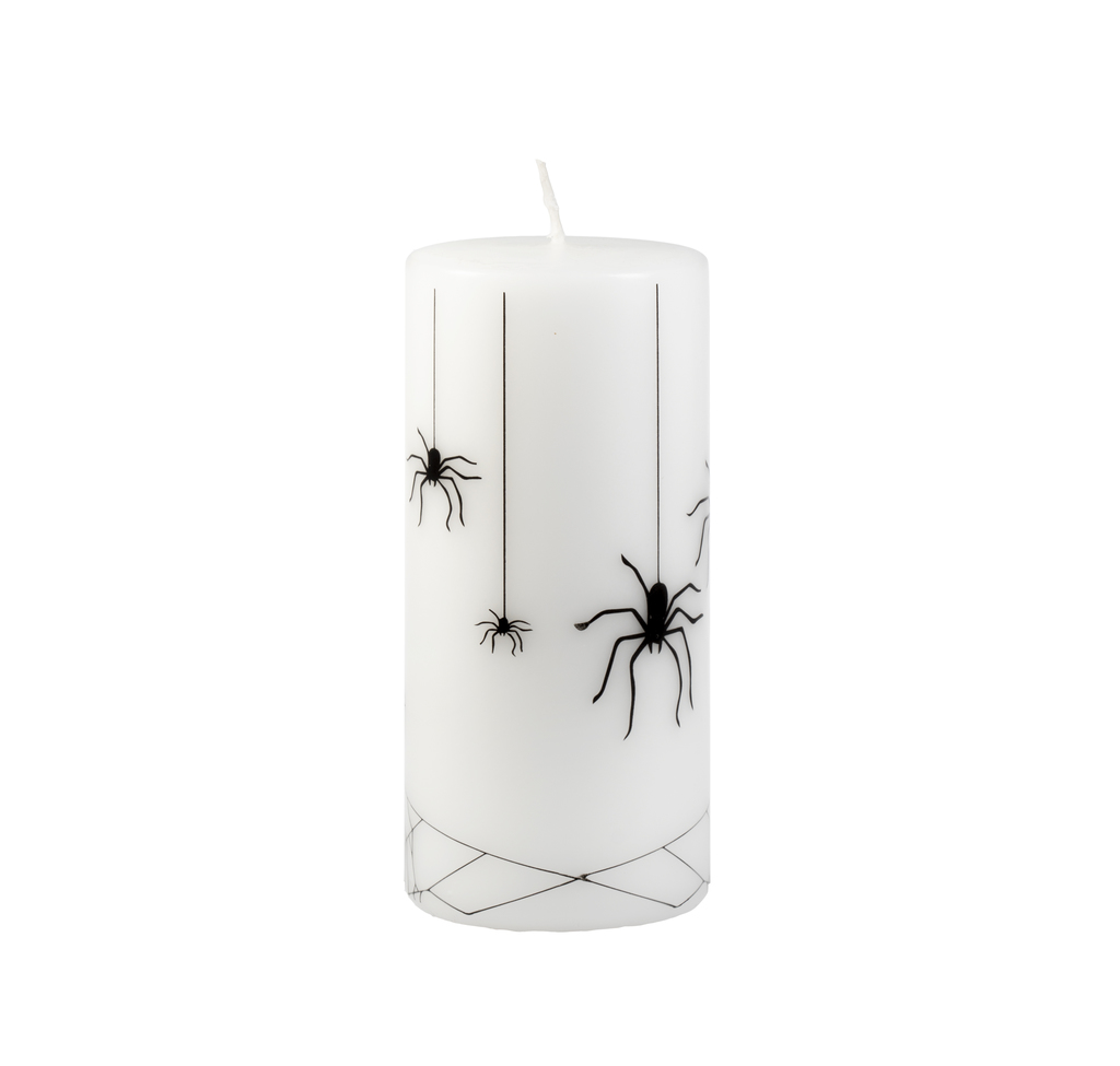Bílá svíčka Halloween s motivem černých pavouků vytvoří s ostatními dekoracemi tu správnou strašidelnou atmosféru.