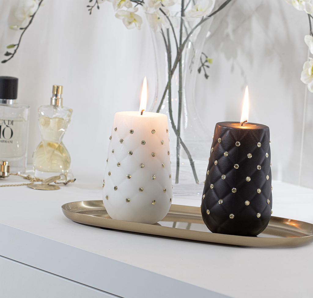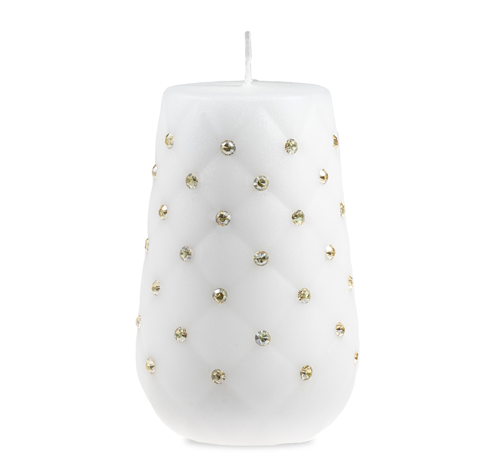 Tato svíčka ve velikosti 80x120 mm zaujme hlubokým matným povrchem a jemným reliéfem, který doplňují ručně vkládané broušené krystaly PRECIOSA se zlatým nádechem. Kombinace matné bílé a třpytu krystalů vytváří harmonický kontrast, jenž okamžitě upoutá pozornost.