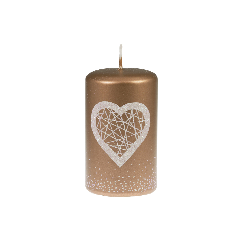 Střední svíčka v krásné hnědo-zlaté metalické barvě s jemným třpytivým dekorem ve tvaru srdíčka.
