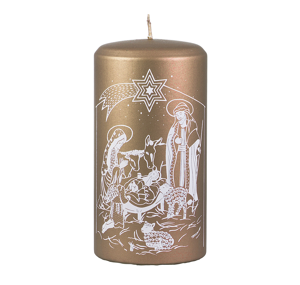 Hnědá vánoční svíčka s tradičním vzorem betlému s detailně zpracovanými postavami.