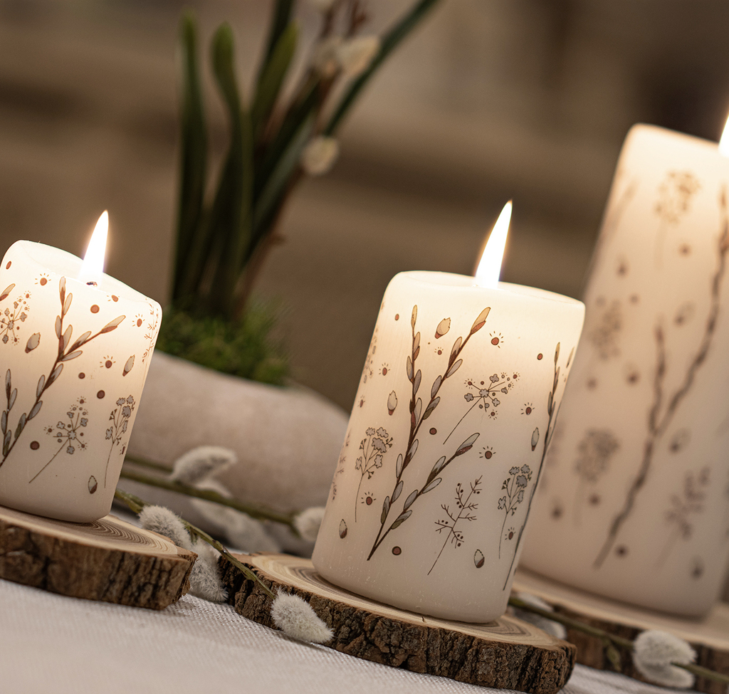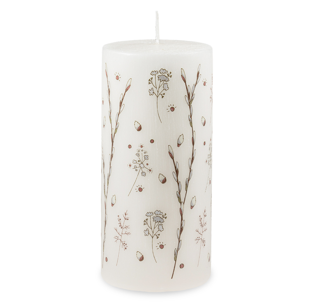 Krémová svíčka s motivem větviček vrby jívy. Každá svíčka má škrábaný povrch zdobený jemnými větvičkami vrby, připomínajícími příchod nového období.