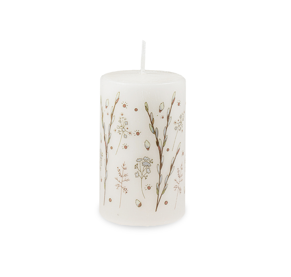 Krémová svíčka s motivem větviček vrby jívy. Každá svíčka má škrábaný povrch zdobený jemnými větvičkami vrby, připomínajícími příchod nového období.
