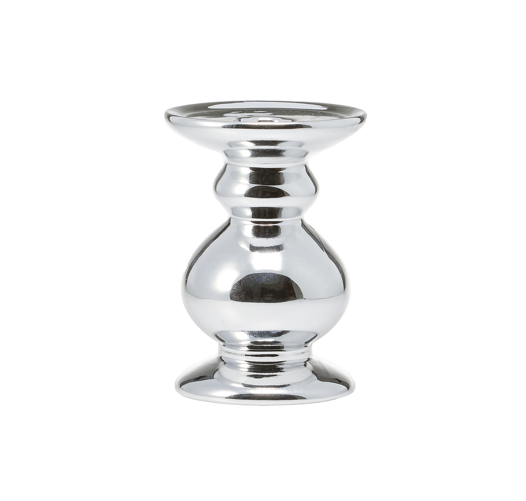 Keramický svícen v lesklé stříbrné barvě vhodný pro svíčky do průměru 7 cm.