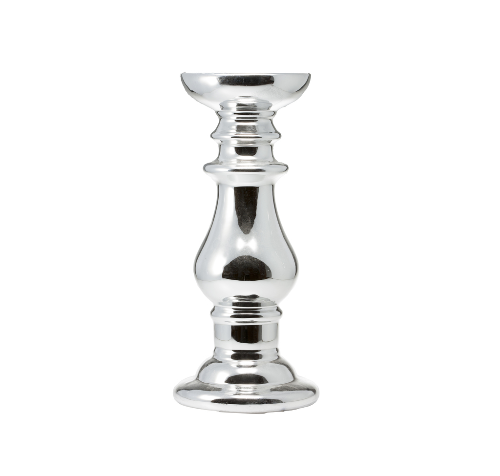 Keramický svícen v lesklé stříbrné barvě vhodný pro svíčky do průměru 8 cm.