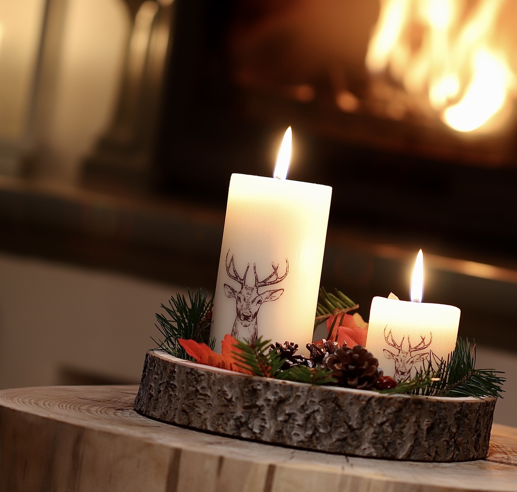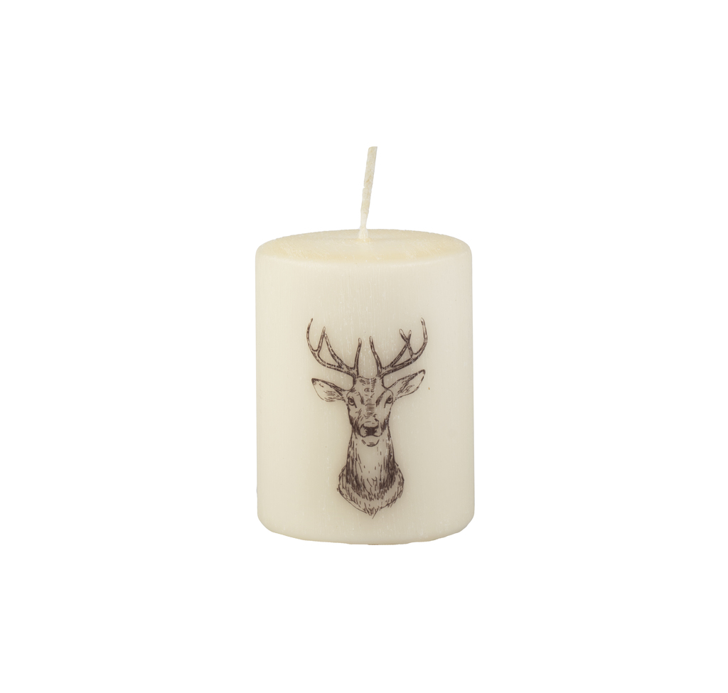 Svíčka v krémové barvě s ručně škrábaným povrchem a s motivem jelena v hnědé barvě.