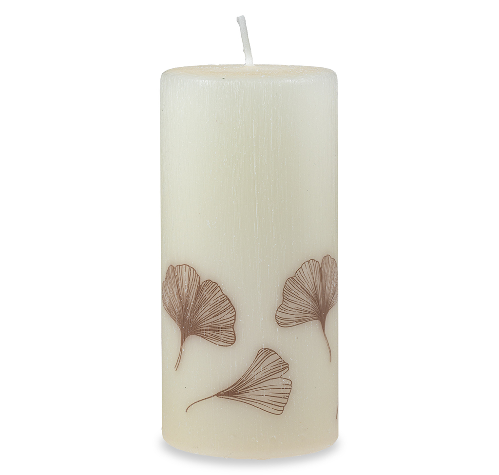 Svíčka z nové limitované edice s motivem hnědých lístků Ginkgo Biloby. Tato krémová svíčka má ručně škrábaný povrch, který dotvoří vašemu interiéru přírodnější nádech.