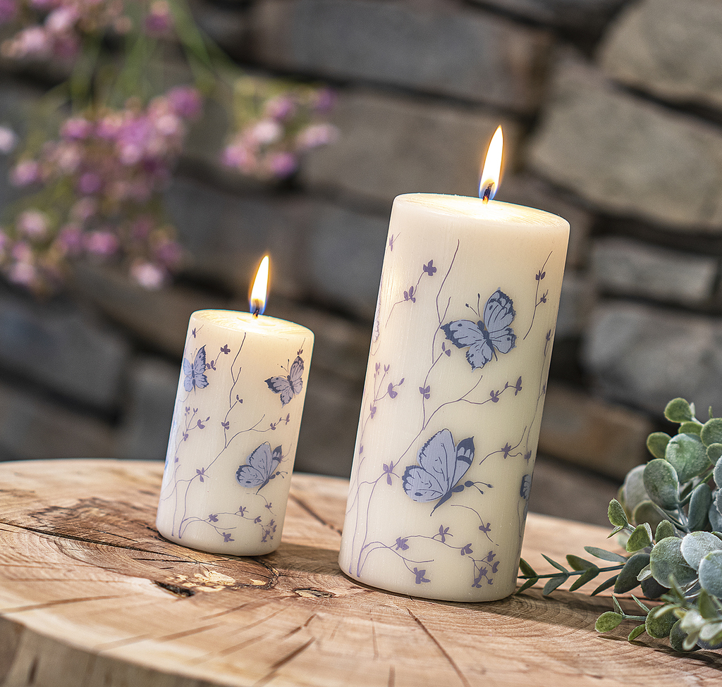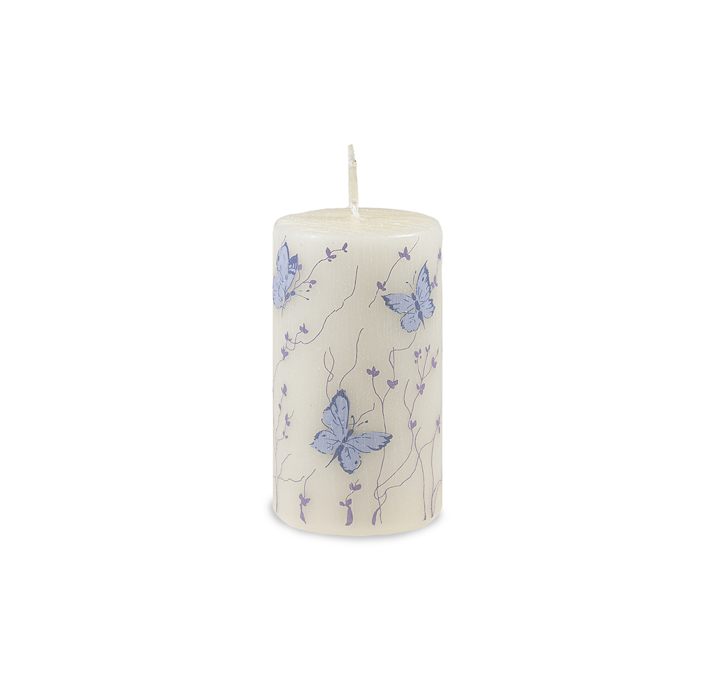 Svíčka v krémové barvě v přírodním designu v jemných barvách se vzorem motýlků.