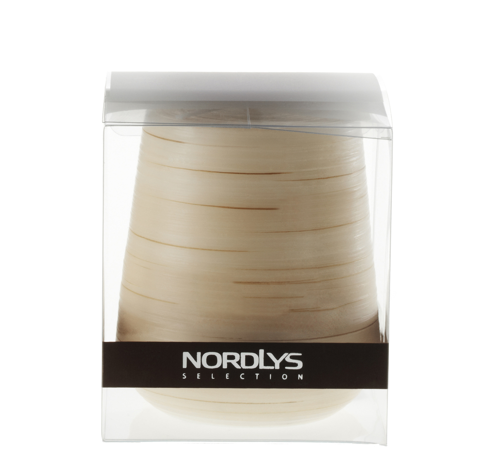 Elegantní krémová svíčka ve skandinávském stylu se strukturovaným povrchem, ručně dozdobená hnědými linkami.