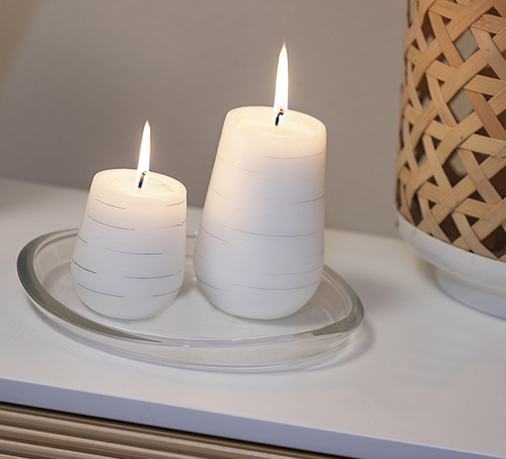 Tác má mírně vlnité okraje. Krásný doplněk, na kterém vynikne jak kolekce bílých svíček, tak i vzorované kolekce.