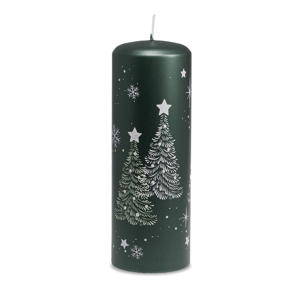 Ponořte svůj prostor do vánoční atmosféry s naší temně zelenou svíčkou ve velikosti 70x200 mm. Okouzlující barva spolu s dekorem bílých a krémových stromečků s třpytivými detaily vytváří harmonický a příjemný vzhled pro vaše vánoční svátky.