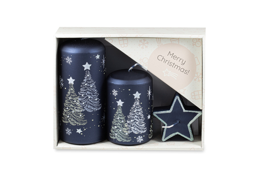 Ponořte svůj prostor do vánoční atmosféry s naší nebesky modrou svíčkou ve velikosti 60x150 mm. Nebeská barva spolu s dekorem bílých a krémových stromečků s třpytivými detaily vytváří harmonický a příjemný vzhled pro vaše svátky.
